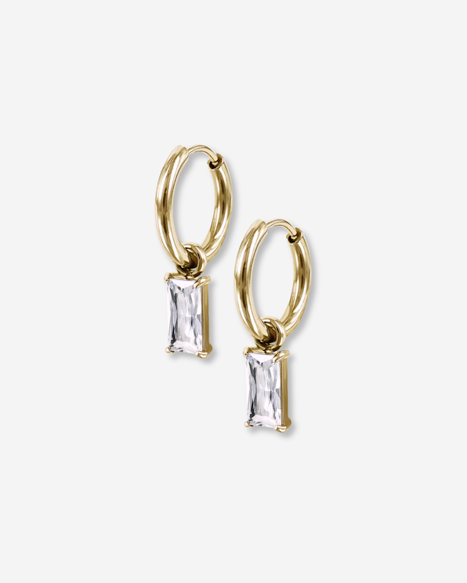 Øyreringar med firkanta zirkonia hengande på.