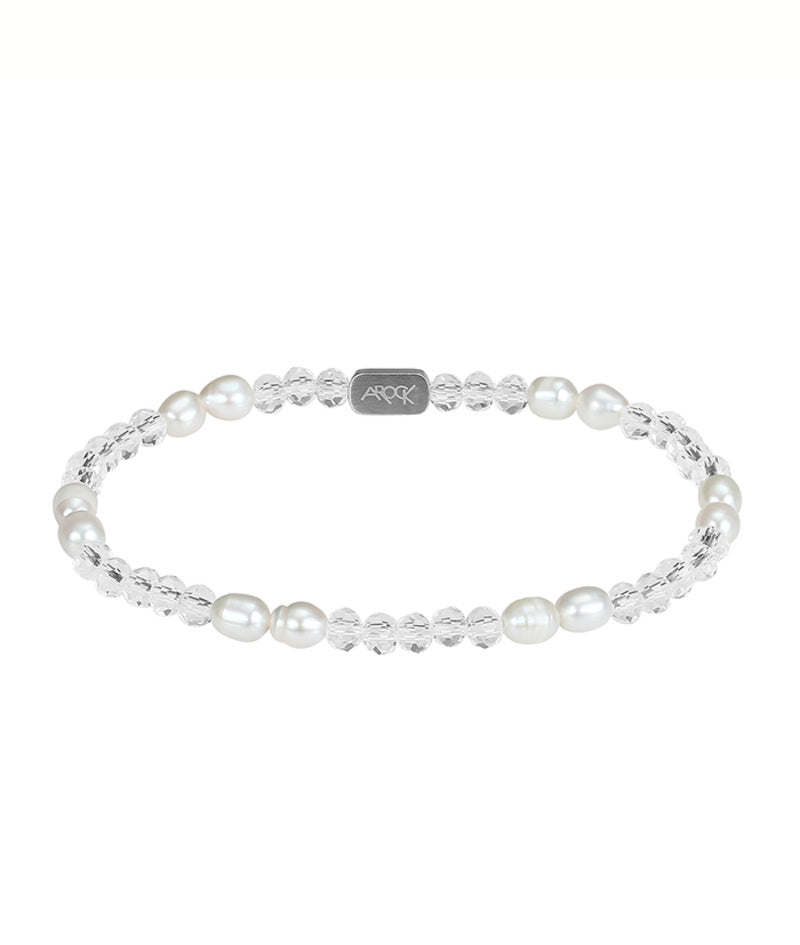 Armband i stål med ferskvassperler, glaskuler og detaljar i stål.
