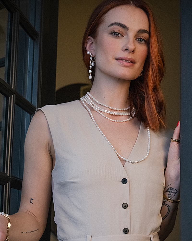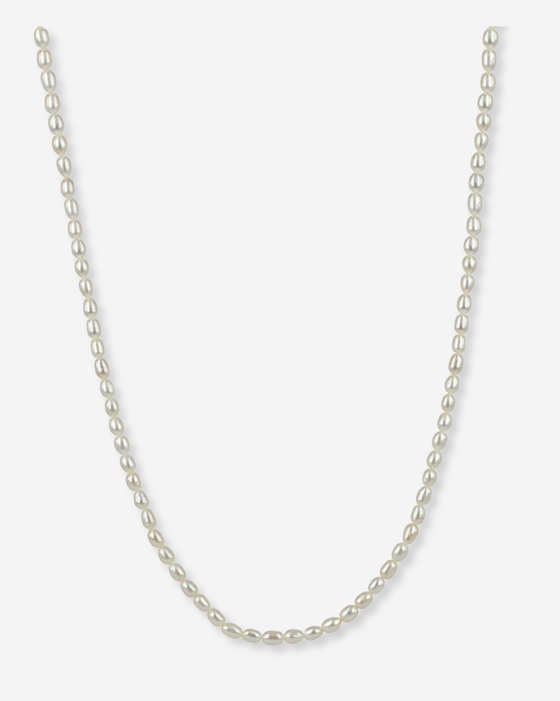 Stilig, langt perlekjede.Breidde: 4,8 mmLengde: 70 cm + 8 cm forlengningskjede. Farge: Stål, forgylt Materiale: Stål, ferskvassperle