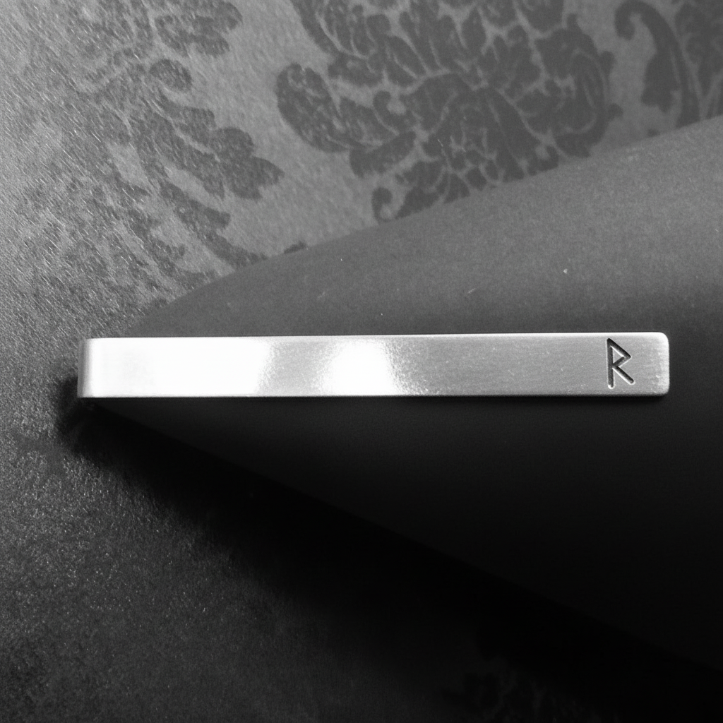 Slipsnål med runer. 6 mm brei i 925 sølv med handstempla symbol, oksidert med matta overflate.