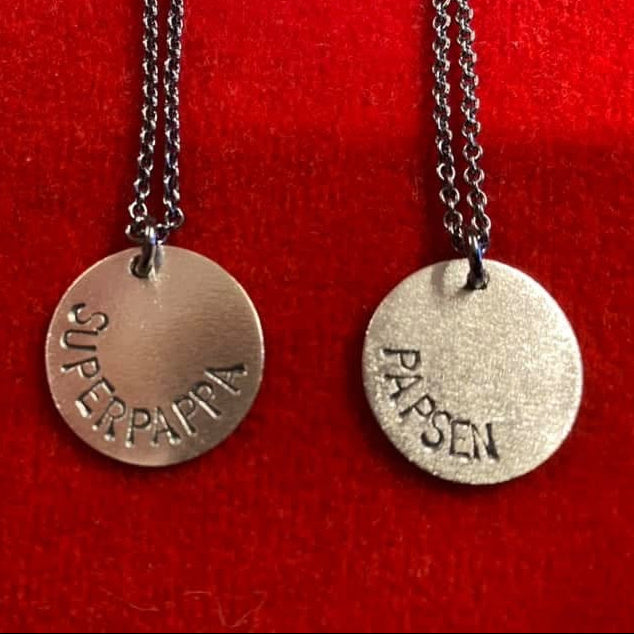 Anheng i sølv med diverse tekstar du kan velje mellom. Deretter veljer du om du vil ha lyst eller oksidert, og til slutt vel du om du vil ha med kjede, og evt. kva lengd. Desse er også fine ilag med Miniknottane våre eller andre små anheng ein har frå før.