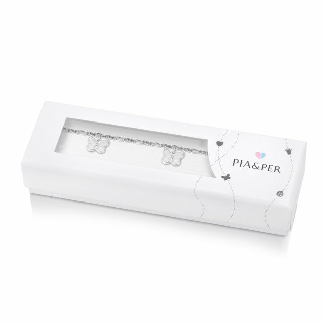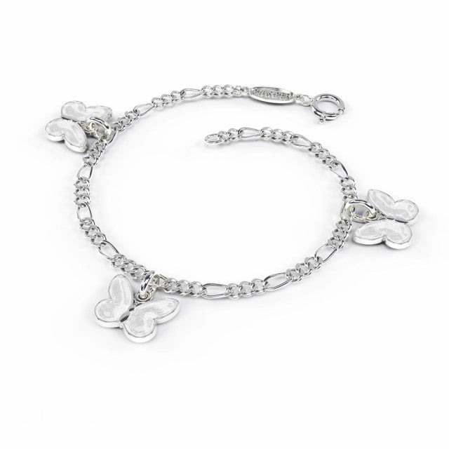 Armband til barn med tre klassiske sommarfuglar med emalje. Armlenkja er ei figarolenkje i sølv og kjem levert i ei søt, lita eske. Finnast og i fleire andre flotte fargar.