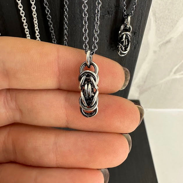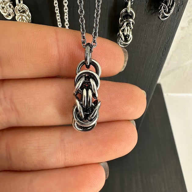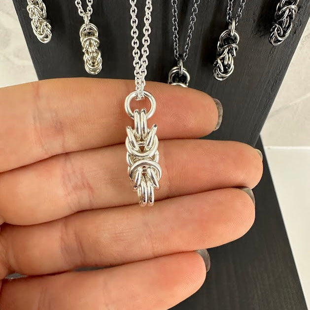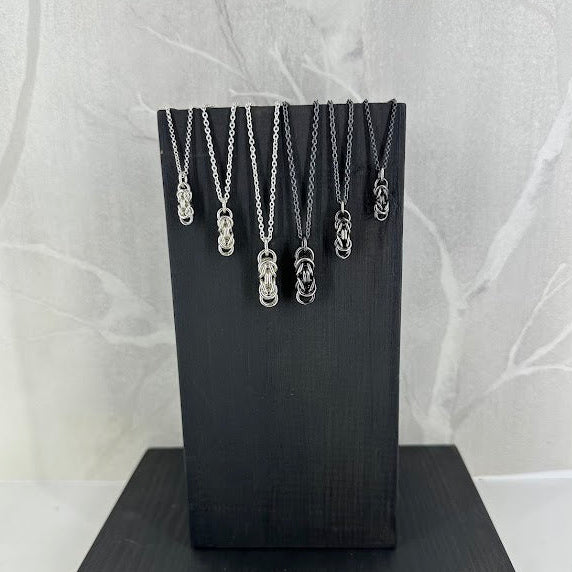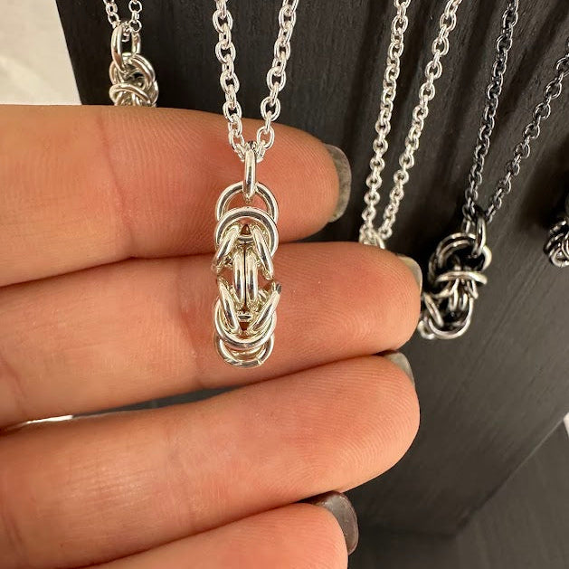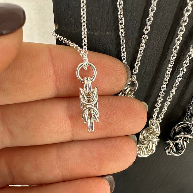 Handlaga anheng av sølvtråd i ulike tjukkelsar. Du kan velje om du vil ha lyst eller oksidert sølv. Velg også om du vil ha med kjede og evt. kva lengd.